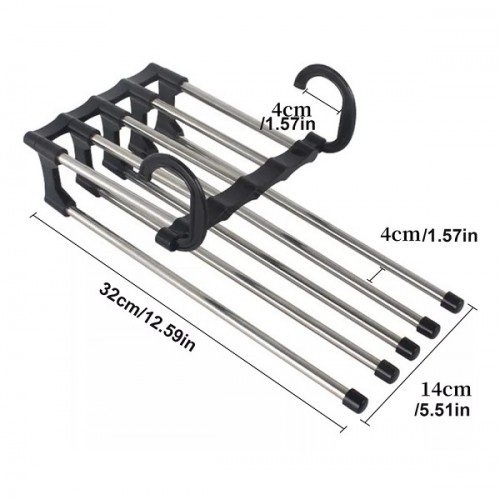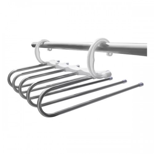 Perchero ideal para colgar y organizar pantalones de manera múltiple, para ahorrar espacio gracias a su práctica de uso vertical, se pueden colgar 5 pantalones, base de plástico resistente y colgadores de acero inoxidable.