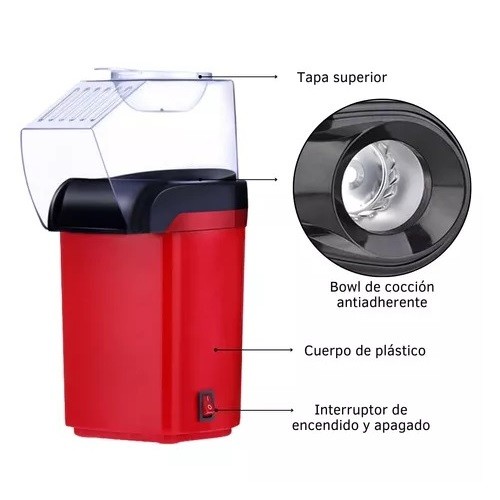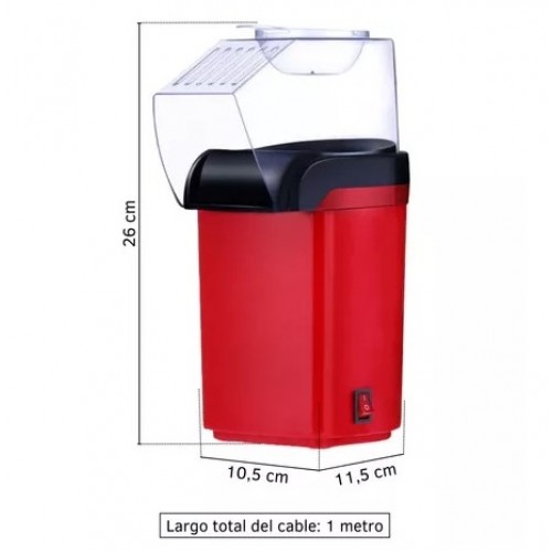 Funcionamiento: Aire caliente. Preparación sin aceite. Pochoclos listos en 3 / 4 Minutos. Muy fácil de Usar.